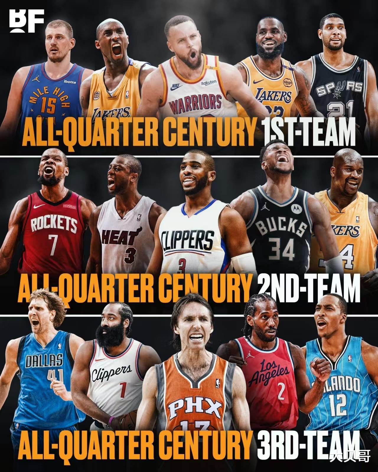 Các cầu thủ trong đội xuất sắc nhất là: Curry, Kobe, James, Duncan và Jokic. Curry hiện là trung phong thứ hai trong lịch sử, chỉ sau Magic. Curry đã tạo ra kỷ nguyên bóng nhỏ và là một trong những cầu thủ tiêu biểu nhất trong lịch sử. Anh ấy là một sự hiện diện mang tính thời đại và là tay súng giỏi nhất trong lịch sử. Curry đã giành được 4 chức vô địch và 1 FMVP. Anh ấy cũng là người duy nhất trong lịch sử nhất trí giành được MVP, điều này thật xuất sắc.