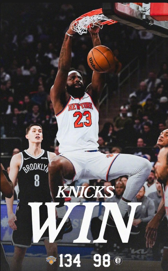 Knicks đã đánh bại Nets với tỷ số 134-98 trên sân nhà ngày hôm nay, thắng 4 trận liên tiếp và nâng thành tích 6 trận thắng và 3 trận thua, đứng thứ ba tại Eastern Conference, chỉ đứng sau Pistons và Cavaliers. Điều đáng nói là Knicks đã phải chịu 3 thất bại liên tiếp trên sân khách trước đó và thắng 4 trận liên tiếp sau khi trở về sân nhà. Tiếp theo, họ sẽ đối đầu với Grizzlies, Magic và Heat trên sân nhà. Họ được kỳ vọng sẽ tiếp tục chuỗi trận thắng và sau đó sẽ mở ra làn sóng 5 trận sân khách liên tiếp. Knicks không thua trên sân nhà mùa này với 6 trận thắng và 0 trận thua, nhưng họ cũng chưa thắng trên sân nhà với 0 trận thắng và 3 trận thua.