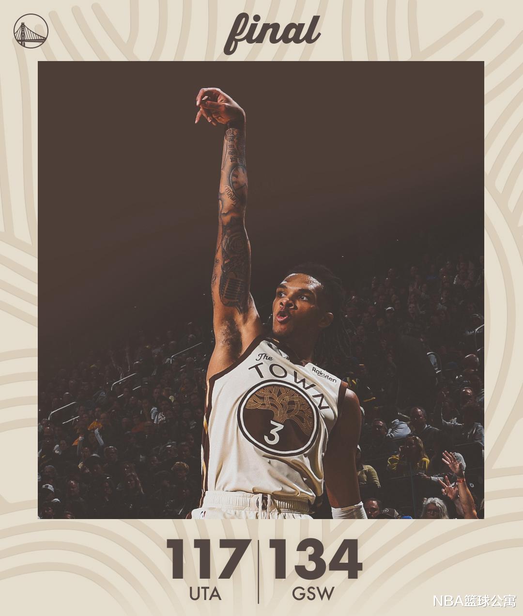 Curry cướp được Markkanen, Hield mắc sai lầm, còn Bailey phản công và lao xuống. George ghi bàn, còn Payton và Bailey thực hiện những cú sút xa. Markkanen thực hiện 1 trong 2 quả ném phạt và Moody thực hiện thành công. George đánh 2+0 và Hield đáp trả bằng ba con trỏ. Chỉ còn chưa đầy 4 phút nữa, Warriors đã dẫn trước 24 điểm để ấn định chiến thắng. Cole vào thay Curry và những người mới bắt đầu, hai đội bắt đầu tập luyện trên sân, thời gian dần dần không còn nữa. Chung cuộc, Warriors đánh bại Jazz với tỷ số 134-117. độc quyền 1 rebound và 1 kiến tạo, Kyle Lee ghi hiệu quả 12 điểm, 7 rebound và 5 kiến tạo trong tỷ số 6 ăn 7, Filipovsky có 11 điểm, 8 rebound và 2 kiến tạo, Nurkic có 8 điểm, 9 rebound và 2 kiến tạo, Collier có 2 điểm, 3 rebound, 3 kiến tạo và 2 cướp, Mykhailiuk có 2 điểm, 3 rebound và 2 kiến tạo, còn Clayton có 1 rebound, 4 kiến tạo và 2 khối.